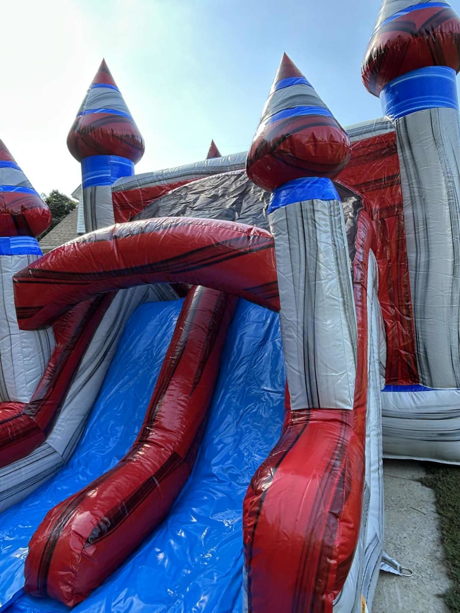 The Titan Combo brings high-energy backyard fun with a dual lane slide, splash pool, and built-in basketball hoop. Bright Spiderman colors and bold graphics capture kids' imaginations. Use the dual lane slide wet or dry for versatile play at every party. Whether you are having a Spiderman themed party or even a Tennessee Titans fan! This combo is sure to be a hit of any party!