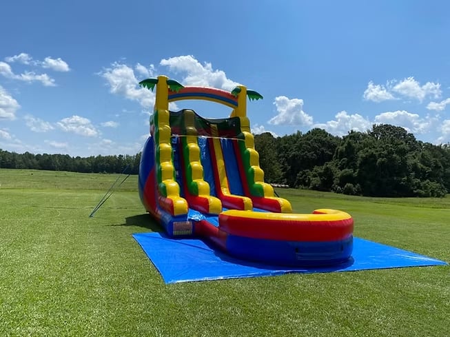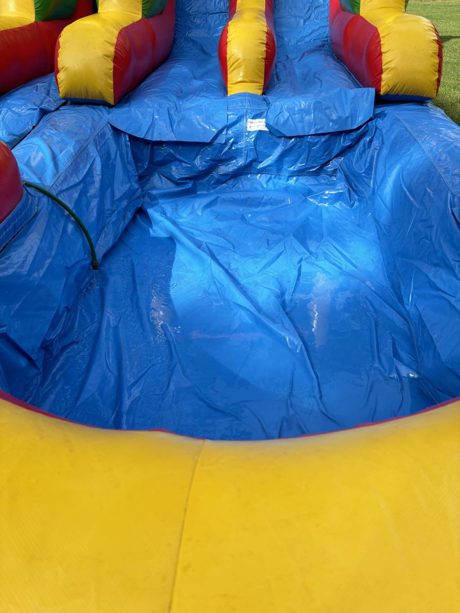The 18ft Dual Lane Rainbow Slide features two side-by-side lanes, allowing two participants to race head-to-head from the top all the way down into a spacious, refreshing pool at the bottom. Measuring 29 feet long and 15 feet wide, this water slide offers plenty of room for safe and exhilarating fun, making it ideal for larger groups and events.